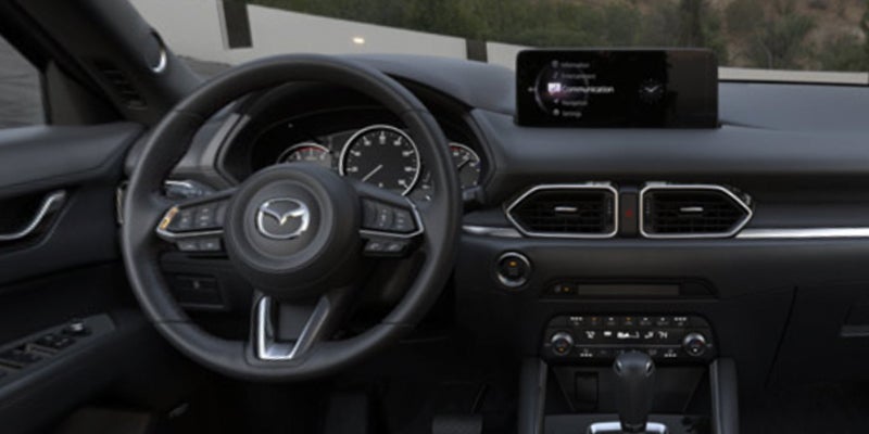 In the CX-5's sophisticated and spacious cabin, you'll find upscale materials and fine craftsmanship that give it a luxury car feel. The base model offers push-button start, cloth seating, and a leather-bound steering wheel and shift knob. The infotainment system features a multifunction controller, a 10.25-inch central display, smartphone integration, Bluetooth, voice command, and Mazda Connected Services.